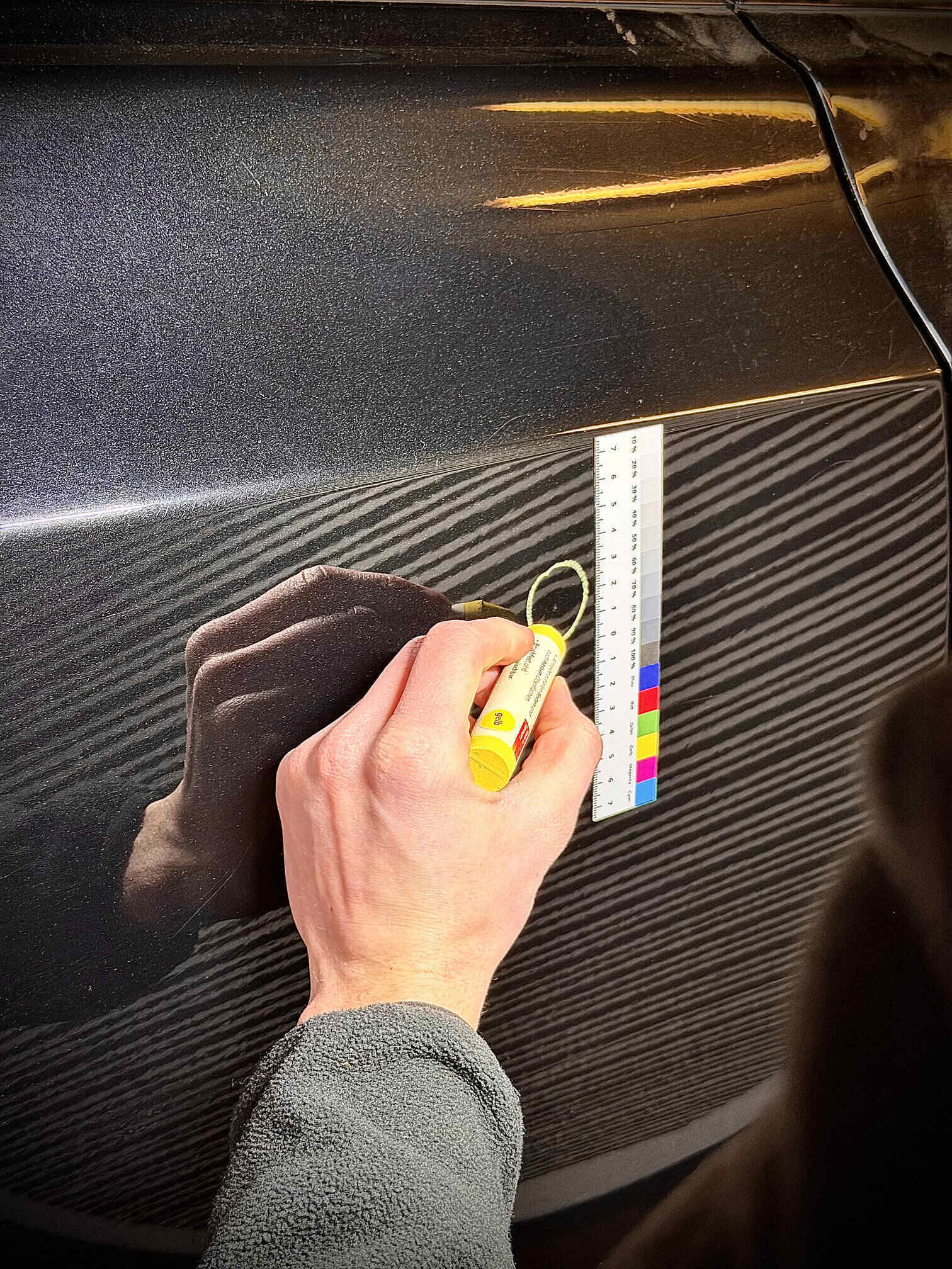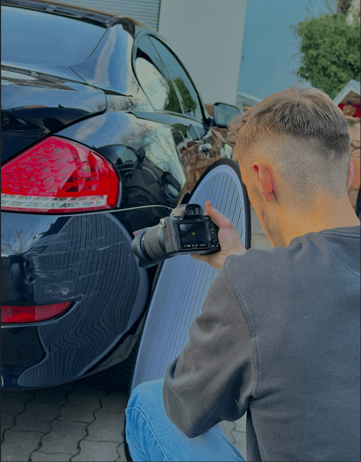 Der Gutachter inspiziert das Fahrzeug sorgfältig, um den Schaden festzustellen. Er macht Fotos und notiert Details.